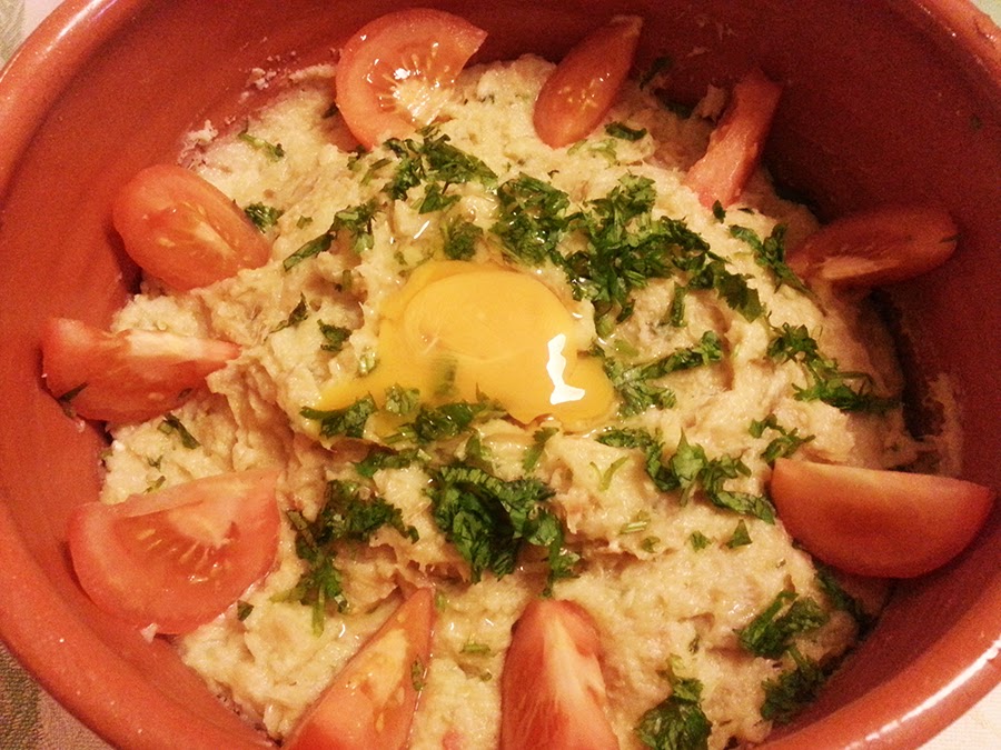 Depois de retirar do lume, acrescento-lhe uma ou duas gemas de ovos para ligar tudo e o resto dos coentros picados. Sirvo com salada de tomate.