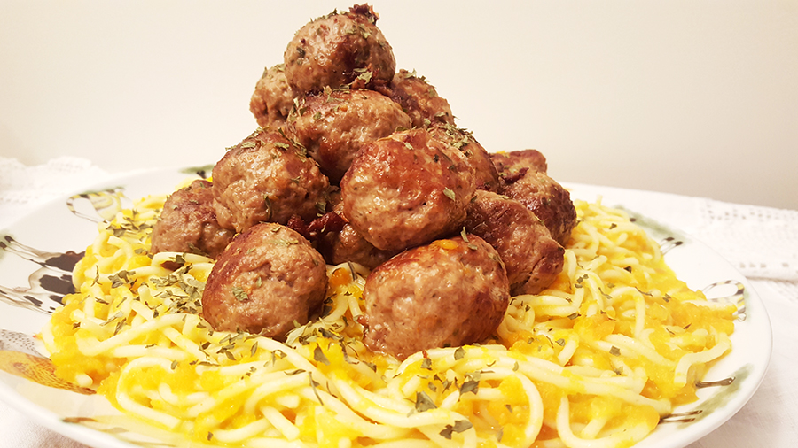 Sirva a massa envolvida no molho e coloque por cima as almôndegas. Polvilhe com ervas a gosto (usei uma mistura de ervas finas secas).
