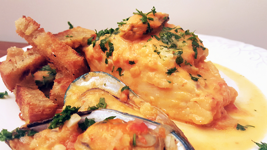 Sirva o bacalhau com os mexilhões, o molho e o pão frito. Polvilhe tudo com salsa e coentros picados.