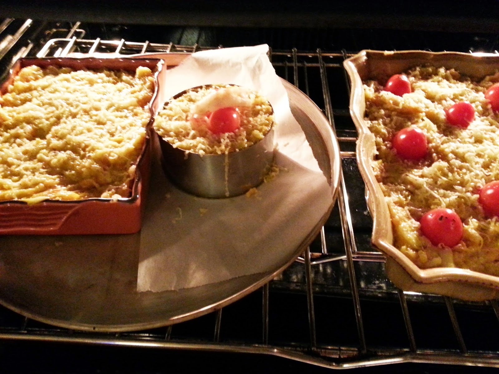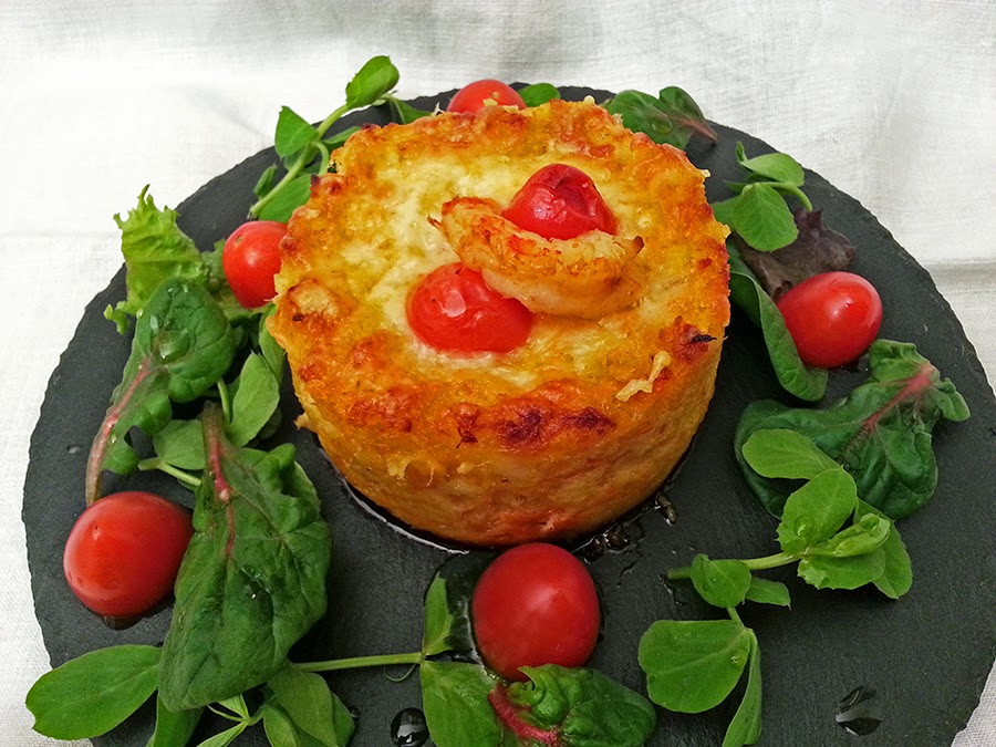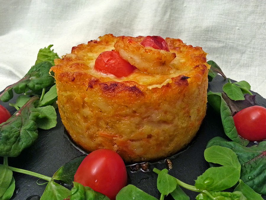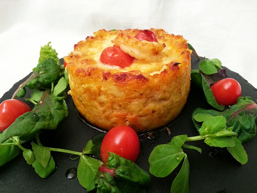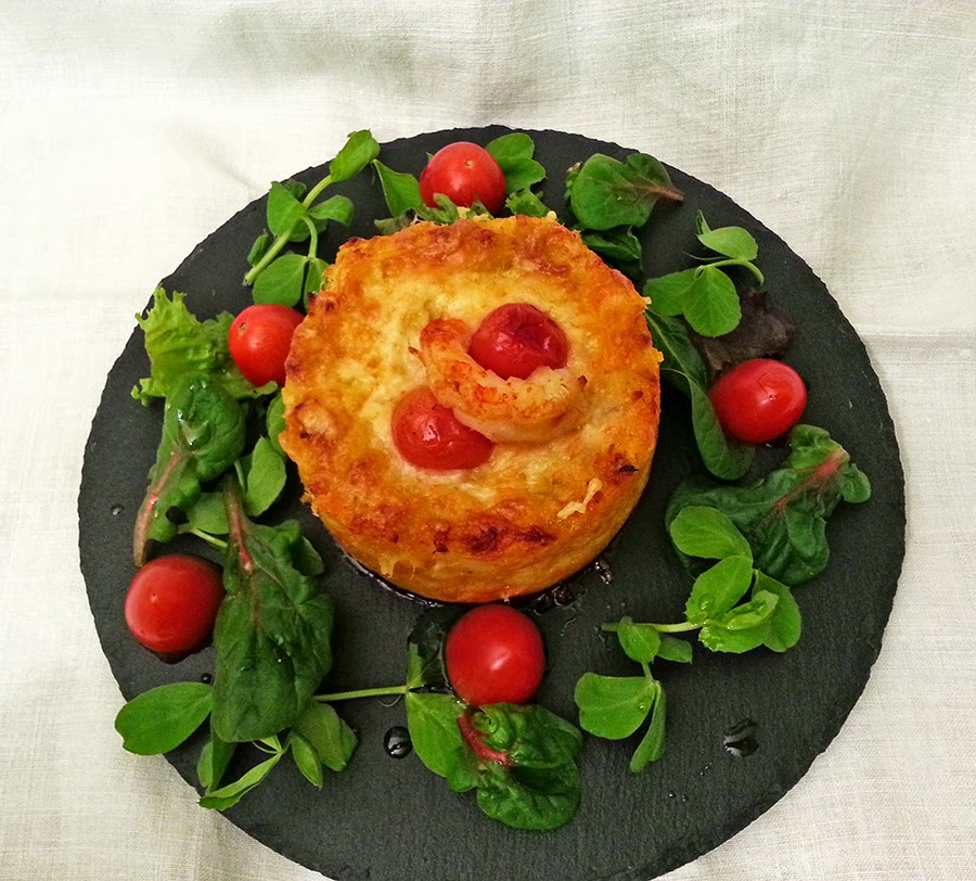 Com a água de cozer o camarão e o bacalhau, um pouco de farinha e manteiga faça um molho bechamel. Envolva todo o preparado no molho, misturando tudo muito bem (ver foto da consistência final). Deite num tabuleiro e espalhe um pouco mais de bechamel por cima para tostar e ficar com um bonito aspeto gratinado. Leve ao forno a 200º cerca de 20 minutos ou até estar gratinado. Pode também adicionar uns tomatinhos cereja ou alguns camarões por cima e levar assim a gratinar, fica com um aspeto final bonito. Em relação ao empratamento, a mistura pode ser colocada num tabuleiro único ou apresentada em doses individuais com a ajuda de um aro redondo (ver foto em baixo).