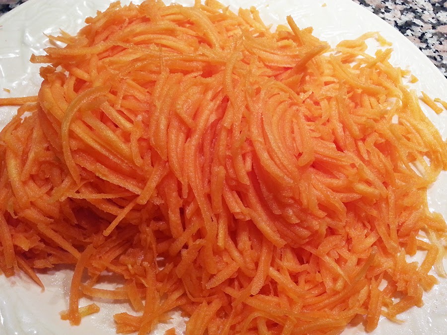 Corte as cenouras em fios grossos com a ajuda de um ralador ou da mandolina (como se fosse para salada, no corte mais grosso – ver foto em baixo). Deite o restante azeite numa frigideira anti aderente e cozinhe as cenouras, temperadas com sal grosso, até estarem moles e uniformemente cozinhadas. Faça isto em lume médio para os fios de cenoura não queimarem. Junte as cenouras ao bacalhau, tendo o cuidado de não levar azeite em excesso para não ficar gorduroso (retire as cenouras da frigideira com uma espumadeira para que isso não aconteça).