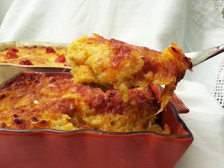 A inspiração para a receita foi o bacalhau espiritual, mas eu uso broa de milho em vez de pão e junto camarões, o que é opcional, pois já tenho feito a receita sem eles e também fica boa. Quando junto os camarões, faço o molho bechamel da água da sua cozedura e isto dá um toque muito especial ao prato, pois fica tudo aromatizado com o sabor do camarão. Uma delícia! Cremoso, consistente, equilibrado entre o salgado do bacalhau e o doce da cenoura e da broa… hum!! Já estou com água na boca 😉 Experimentem e depois digam-se se gostaram.