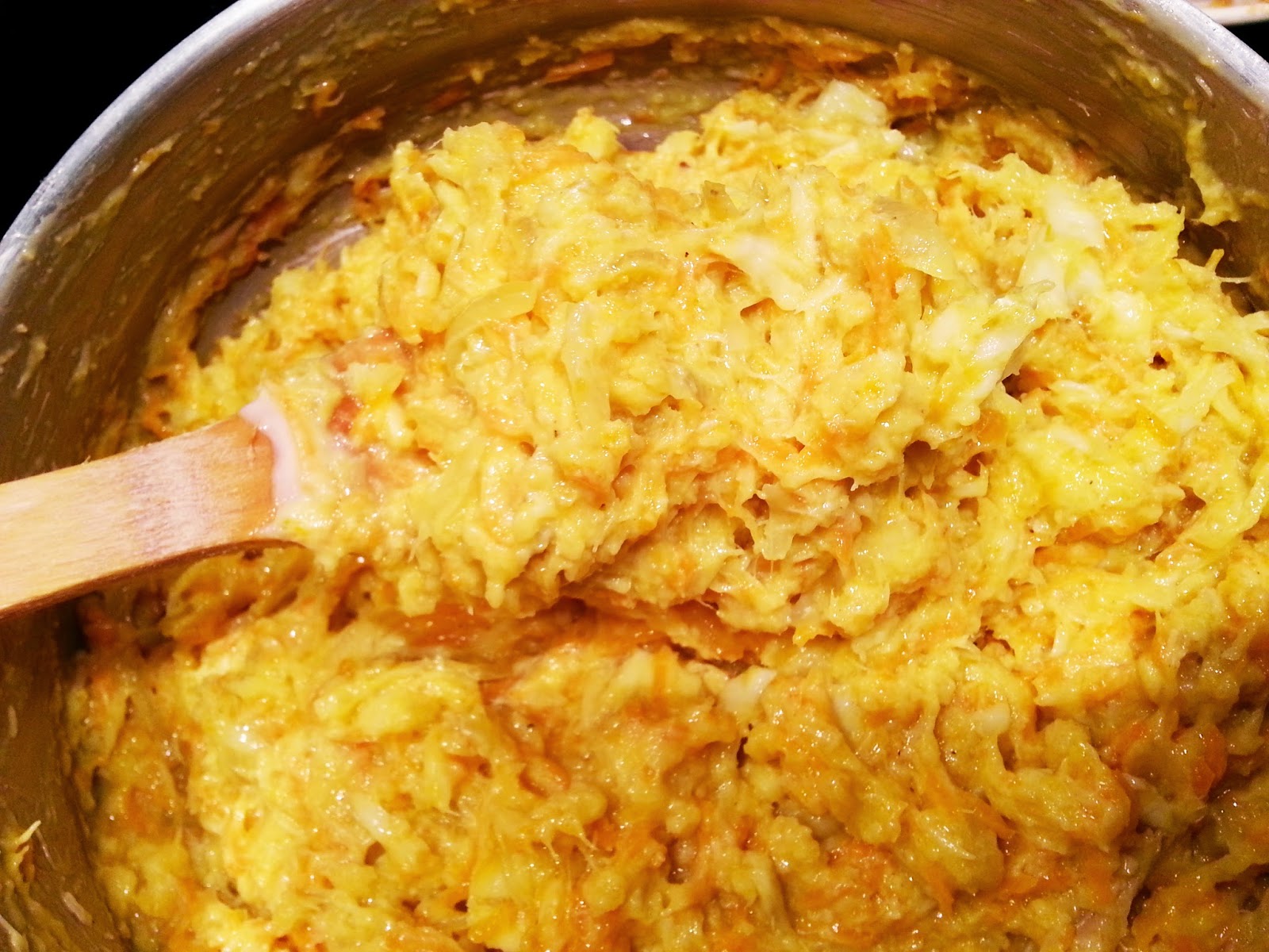 Triture a broa de milho na picadora ou processador de alimentos. Amoleça a broa levemente com um pouco da água de cozer o camarão. Junte a broa e o miolo de camarão ao preparado de bacalhau e misture tudo. Tempere com pimenta moída na altura e prove para retificar o sal e a proporção entre o bacalhau e os outros ingredientes mais adocicados, a broa e a cenoura.