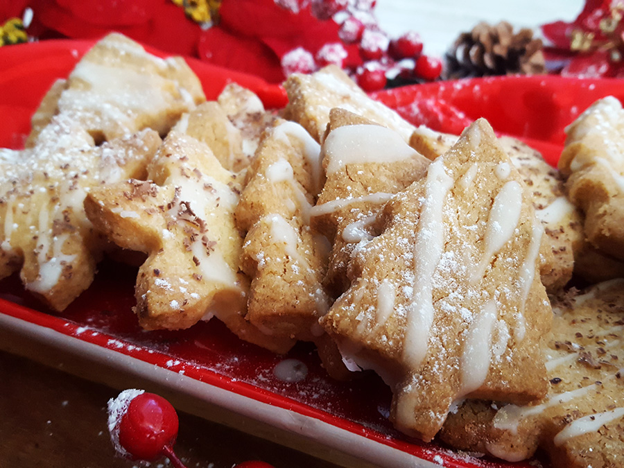 Amasse todos os ingredientes bem, forme um rolo, envolva em película aderente e leve ao frigorífico cerca de 30 minutos. Depois estique a massa com o rolo, corte no formato que desejar (eu usei um cortante estrela e outro em forma de árvore de Natal) e leve ao forno pré aquecido a 190º durante 12 a 15 minutos até os biscoitos estarem levemente dourados. Retire do forno e deixe-os arrefecer. Numa taça tenha o açúcar em pó e vá deitando sumo de laranja (muito pouco de cada vez, 1 a 2 colheres de chá), mexa bem até formar um glacé. Decore os biscoitos com este glacé e com raspas de chocolate. Deixe o glacé arrefecer até solidificar e sirva os biscoitos ou guarde-os em latas para oferecer no Natal.