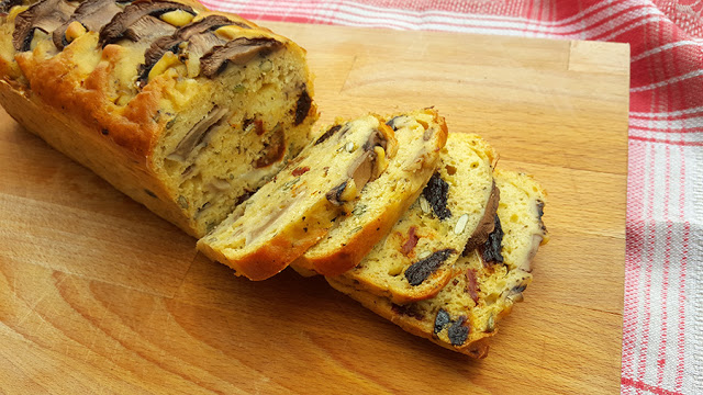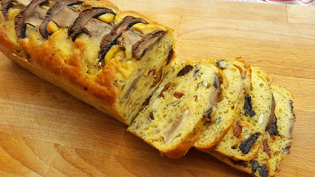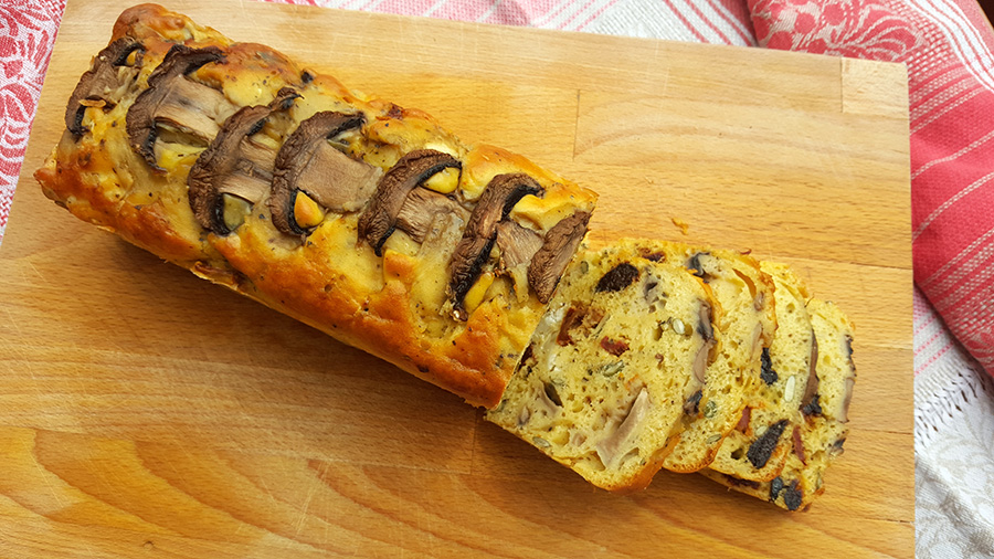 Bata os ovos inteiros na batedeira elétrica até ficarem com uma textura de mousse e tenham dobrado ou triplicado o volume. Depois tempere com sal, pimenta, folhas de manjericão seco e acrescente o iogurte e o azeite. Misture. Adicione a farinha peneirada e envolva bem. Por fim junte o queijo partido em pedaços, os tomates e ameixas secas também em pedaços e as sementes. Deite a massa numa forma retangular untada e disponha algumas fatias de cogumelos por cima.