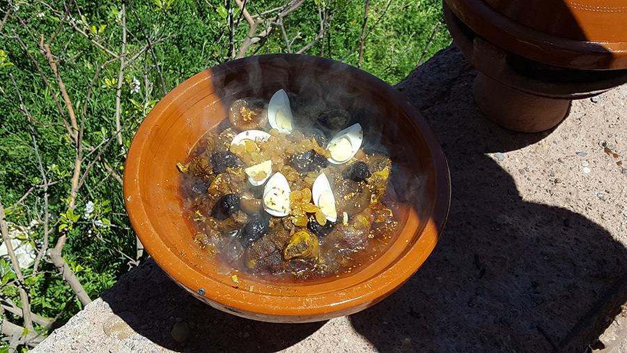 As tâmaras também são um dos ingredientes utilizados na doçaria do norte de África, bem como nos pratos salgados. A melhor tagine que comi durante as férias foi esta a que chamam “mrouzia” e que podem ver nas fotos. É composta por carne de borrego e um molho espesso e doce com nozes, tâmaras e ameixas secas ou outros frutos secos. Também levava ovos cozidos. Gostei imenso desta tagine que comemos num dos almoços enquanto fazíamos a viagem pela montanha do Atlas, a caminho de Ouazarzate e das Portas do Deserto. Tagine é o nome do prato e também do recipiente de barro em forma de chaminé onde cozinham a carne, legumes ou outros ingredientes. Normalmente a carne é de borrego ou frango. Também há tagines vegetarianas e de peixe.