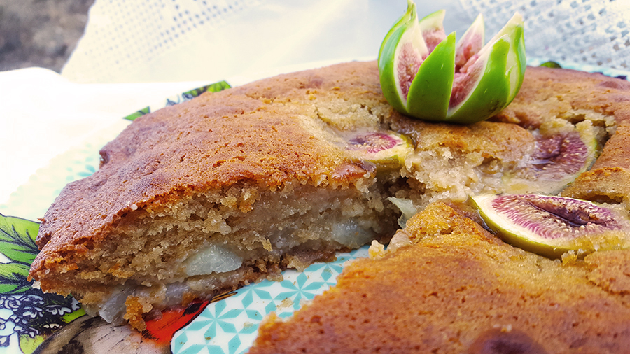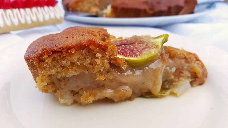 Numa tarteira forrada com papel vegetal, disponha 2 peras cortadas em fatias. Por cima disponha a massa e alise. Corte os figos em metades e disponha por cima da massa. Coza em forno a 180º durante cerca de 40 minutos ou até a massa estar firme. Eu optei por deixar o bolo um pouco cremoso no meio, mas podem cozer mais, conforme o fosso gosto. A fruta vai sempre dar alguma humidade a este bolo. Fica uma delícia!