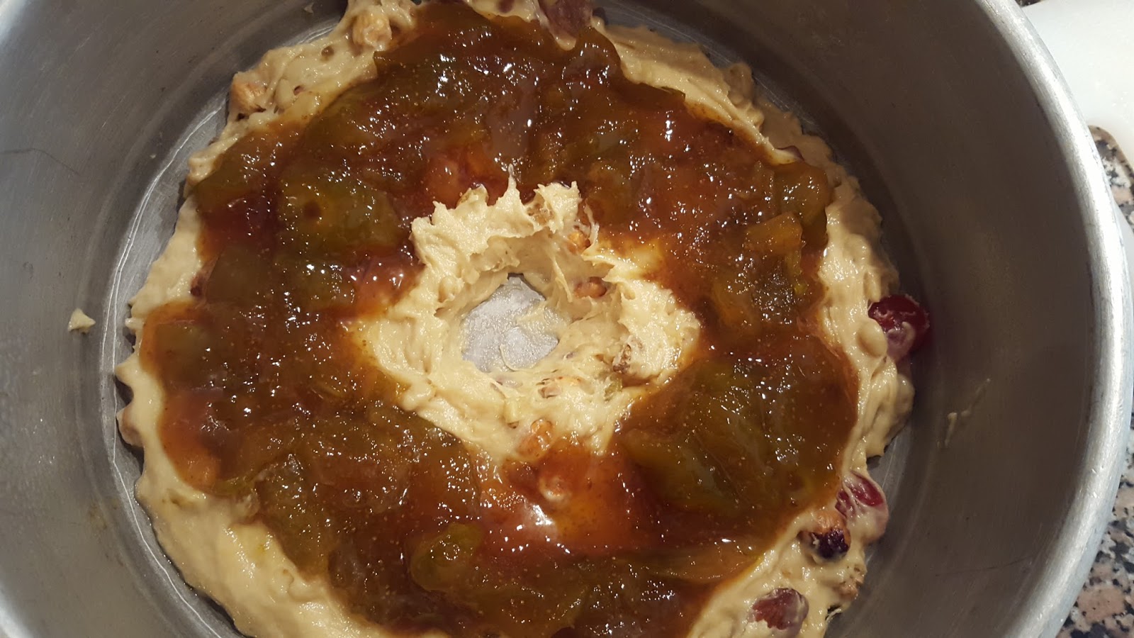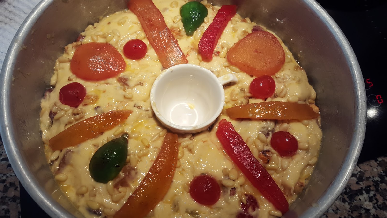 Depois volte a amassar um pouco e incorpore os frutos secos e cristalizados. Deixe repousar mais 45 minutos. Eu fiz este bolo numa forma porque a massa é muito tenra e levou o recheio no meio. Tratando-se de consistências mais moles, é preferível usar uma forma para que o bolo não se desmanche. Depois da massa repousar pela segunda vez, já com as frutas incorporadas, deite metade do preparado numa forma untada, coloque o doce de figo por cima espalhando uniformemente (ver foto) e depois deite por cima a restante massa. Para a massa não fechar no meio, coloque uma chávena de café a fazer o buraco (ver foto). Disponha pedaços de fruta cristalizada e pinhões por cima