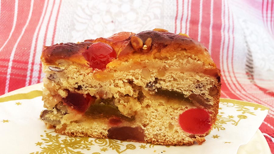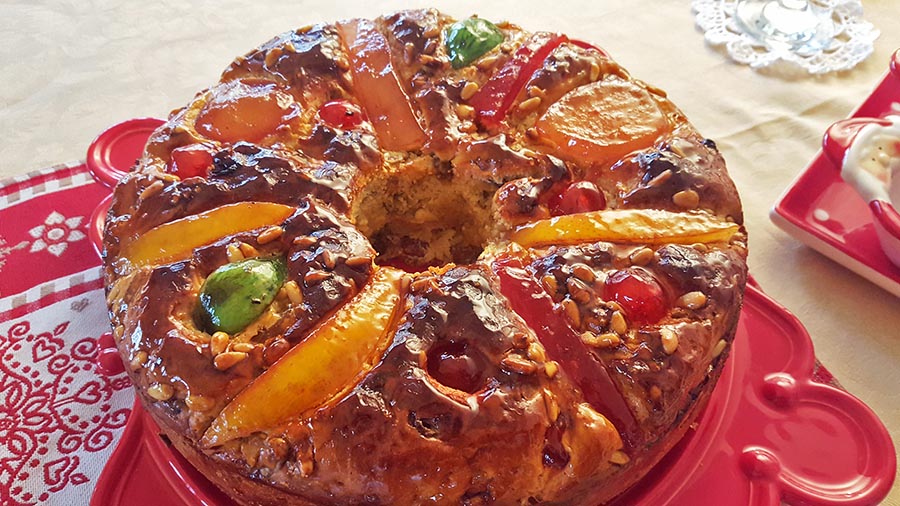 De véspera deixe as frutas cristalizadas a macerar em vinho do Porto e sumo de laranja. O vinho e o sumo podem depois ser utilizados na massa. No dia de fazer o bolo, comece por diluir o fermento de padeiro granulado no leite tépido. Depois junte uma chávena de farinha (que deve ser retirada à quantidade total), misture, faça uma pasta e deixe repousar para levedar durante 15 minutos. Enquanto começa a fazer a massa, este preparado vai crescer para o dobro. Na batedeira (com o gancho de amassar) ou à mão, bata a manteiga com o açúcar numa velocidade média.