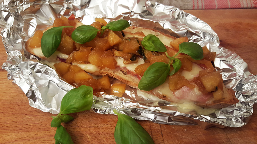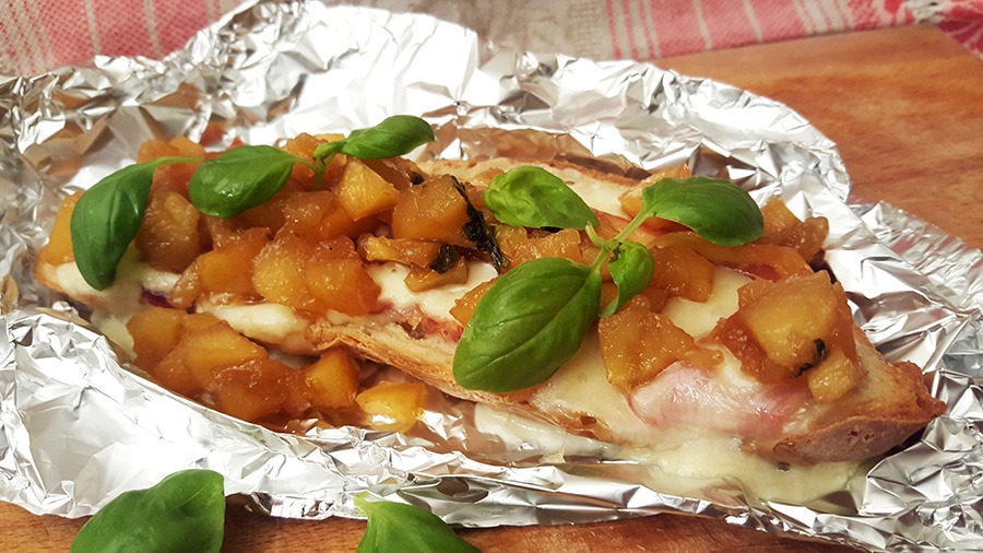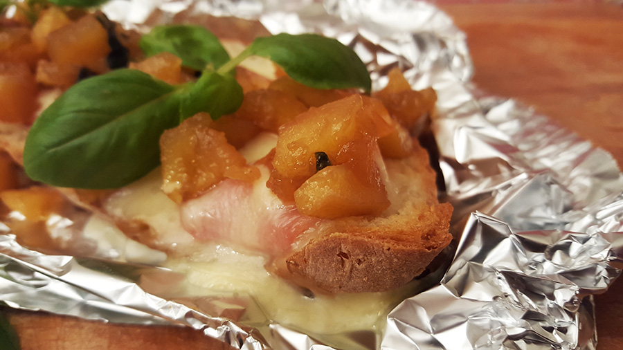 Entretanto, pincele a fatia de pão com o azeite e coloque o presunto por cima. Leve ao forno pré aquecido a 180º por 5 a 8 minutos. Quanto o presunto começar a tostar e a encarquilhar, disponha o queijo por cima e volte a colocar no forno. Assim que o queijo estiver completamente derretido, retire do forno, coloque a bruschetta numa tábua ou prato de servir e coloque o chutney de gamboa por cima. Guarneça com folhas de manjericão fresco. A frescura do manjericão conjuga lindamente com o salgado do presunto e queijo e com o adocicado do chutney.
