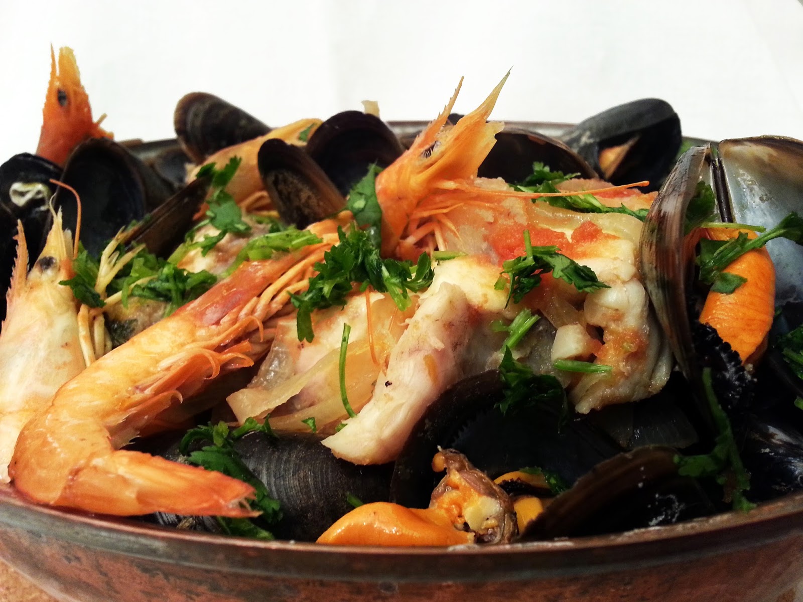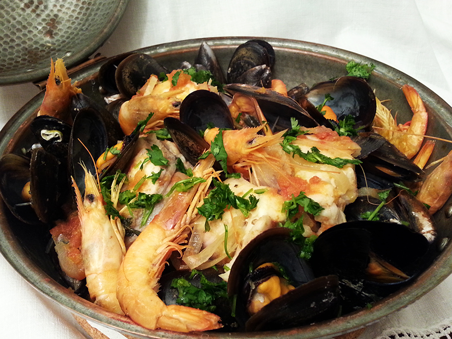 Deixe o peixe cozinhar 7 minutos e, ao fim desse tempo, junte os camarões e os mexilhões depois de bem lavados. Deixe cozinhar mais 3 minutos. Desligue o lume, retire o ramo de ervas frescas, polvilhe tudo com coentros picados na altura e sirva com batata cozida ou frita. Se servir com batata doce também fica delicioso!