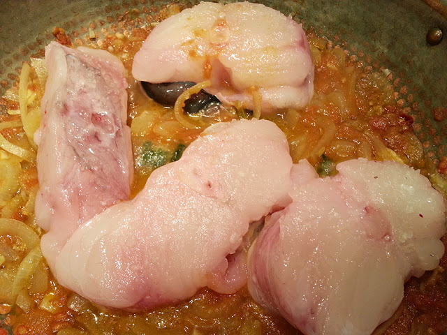 Neste momento junte um ramo de cheiro com salsa e coentros frescos. Junte um pouco de vinho branco, que não serve apenas para criar molho, mas também para dar sabor. Deixe a cebolada apurar um pouco mais e, quando a cebola estiver cozinhada, junte os pedaços do tamboril. Tempere de sal e pimenta, junte os restantes alhos laminados por cima do peixe a pimenta da terra ou uma malagueta “comum” para quem gostar. Eu não juntei muita pimenta da terra para não ficar muito forte e porque era a primeira vez que usava este ingrediente.