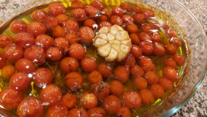Lave os tomates, seque-os e disponha-os num tabuleiro de forno. Pode temperar com sal ou não, é opcional. Se optar por fazer sem sal, pode temperar a gosto posteriormente, no momento de servir. Junte uma cabeça de alhos cortada ao meio e hastes de alecrim. Cubra com azeite e leve ao forno a 170º durante uma hora. Assim que os tomates estiverem um pouco murchos e a pele começar a rachar, está pronto. Retire do forno e coloque os tomates e o azeite ainda quentes em frascos esterilizados (azeite deve ficar a cobrir totalmente todos os tomates). Feche bem os frascos e vire-os de cabeça para baixo. Deixe assim de um dia para o outro para ganhar vácuo. Vai conservar-se até 2 semanas no frigorífico. Retire do frio algum tempo antes de consumir.