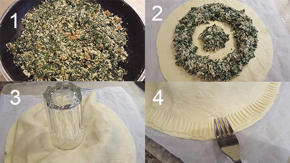 Saltear os espinafres em azeite e alho. Juntar o requeijão quando os espinafres estiverem praticamente cozinhados. Esmagar bem o requeijão com um garfo, temperar com sal e pimenta, misturar tudo e, por fim, juntar as nozes partidas grosseiramente. Deixe a mistura a arrefecer. Ligue o forno a 190ºC.
