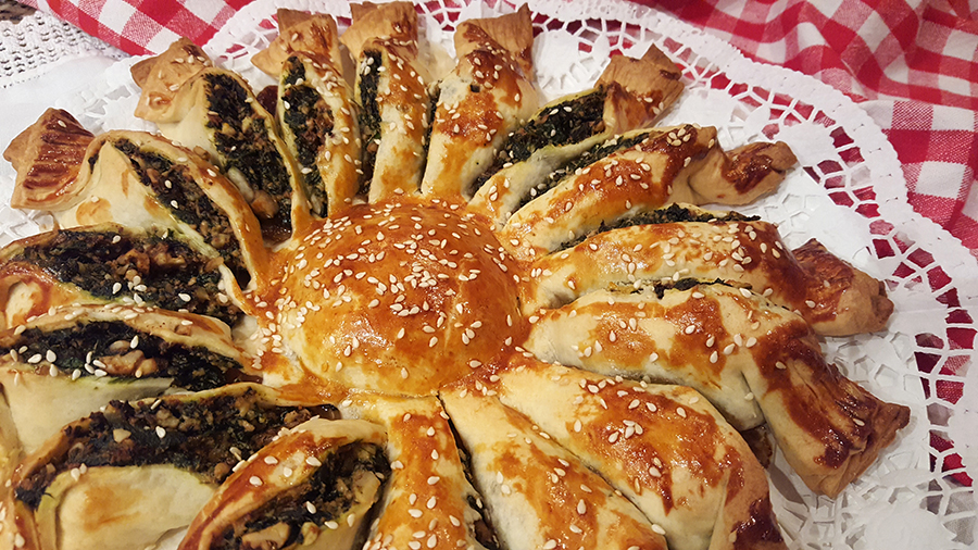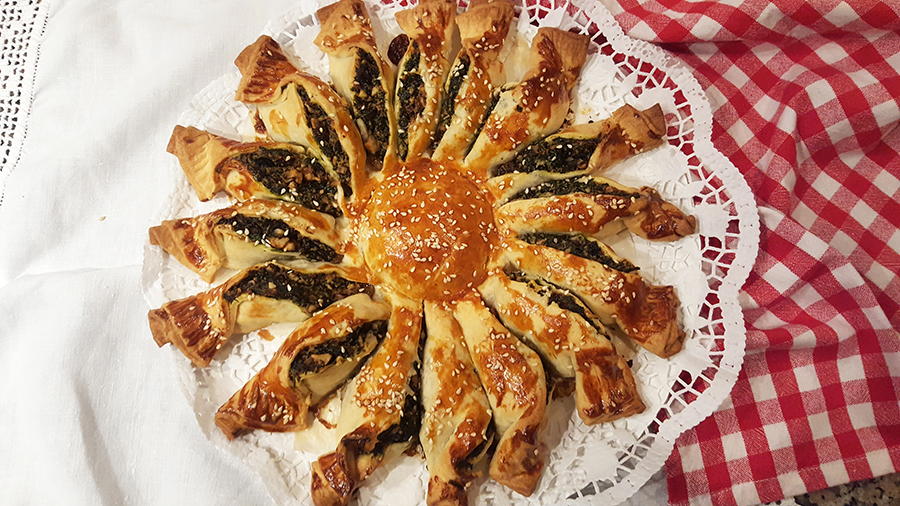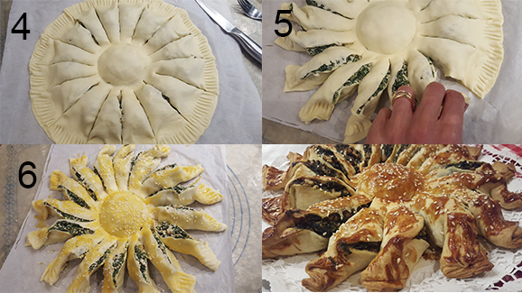 Quando o preparado estiver arrefecido, disponha-o numa das placas de massa como se vê na imagem (um pedaço no meio e uma coroa à volta). Coloque a outra placa de massa por cima e molde o centro com a ajuda de um copo. Calque a massa a toda a volta com um garfo. Corte a rodela em quartos e depois novamente até obter 16 fatias. Não corte o círculo do centro. Dobre cada fatia ligeiramente para fazer o efeito desejado. Pincele com gema de ovo batida e polvilhe com sementes de sésamo. Leve ao forno pré-aquecido a 190ºC durante cerca de 40 minutos ou até a massa estar cozida e dourada. Sirva quente ou frio.