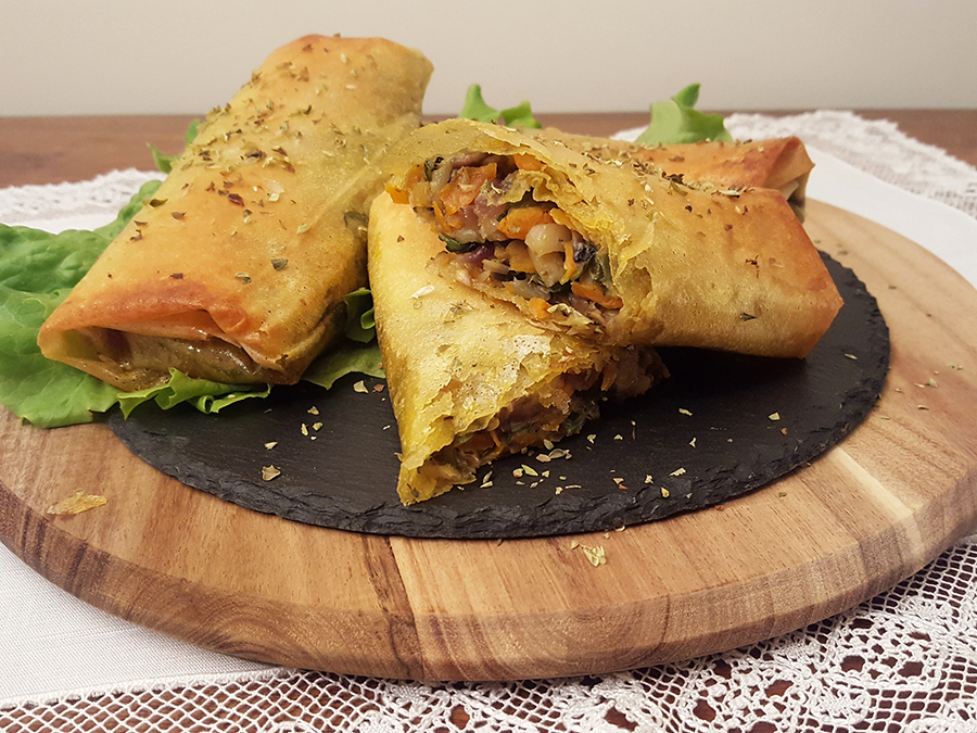 Aqueça o forno a 200º e prepare os crepes. Abra as folhas de massa brick e pincele-as com manteiga derretida. Sobreponha as folhas 2 a 2 e coloque uma porção de legumes no meio. Feche os crepes, começando pela zona mais estreita, ou seja, pelos topos. Depois de fechar os topos, feche as laterais, apertando bem e pincelando com mais um pouco de manteiga para “colar”. Disponha os crepes num tabuleiro forrado com papel vegetal. Pincele-os com manteiga derretida e polvilhe com oregãos. Coloque o tabuleiro na posição do meio do forno e deixe cozinhar até a massa estar dourada e crocante (cerca de 15 minutos). Sirva com salada.