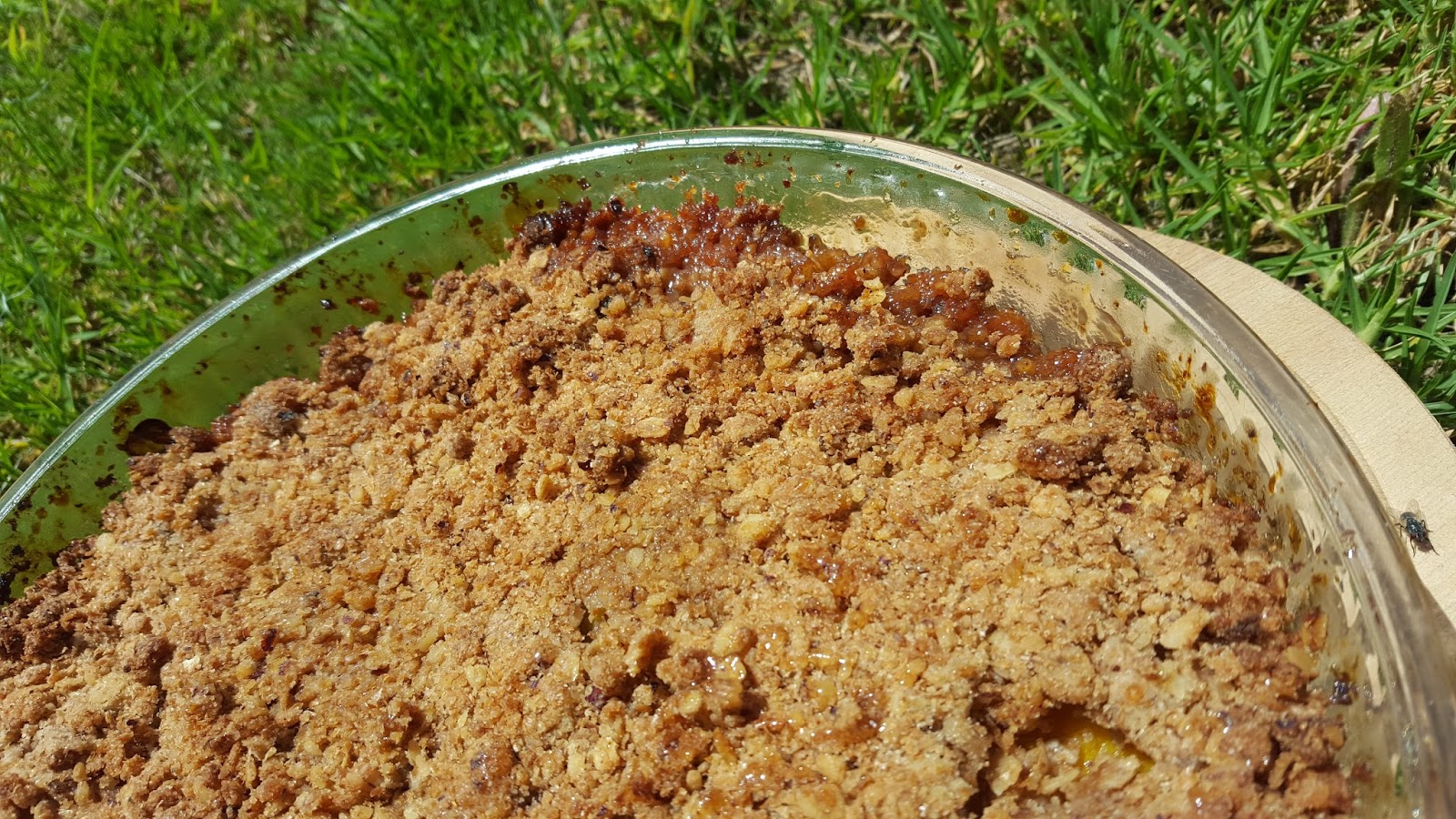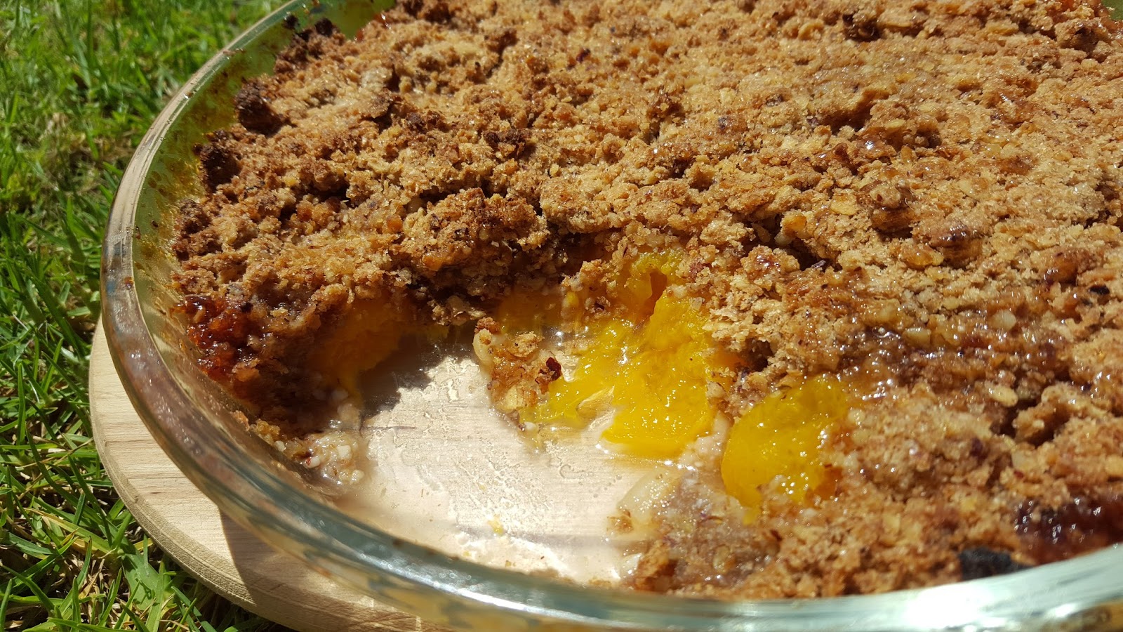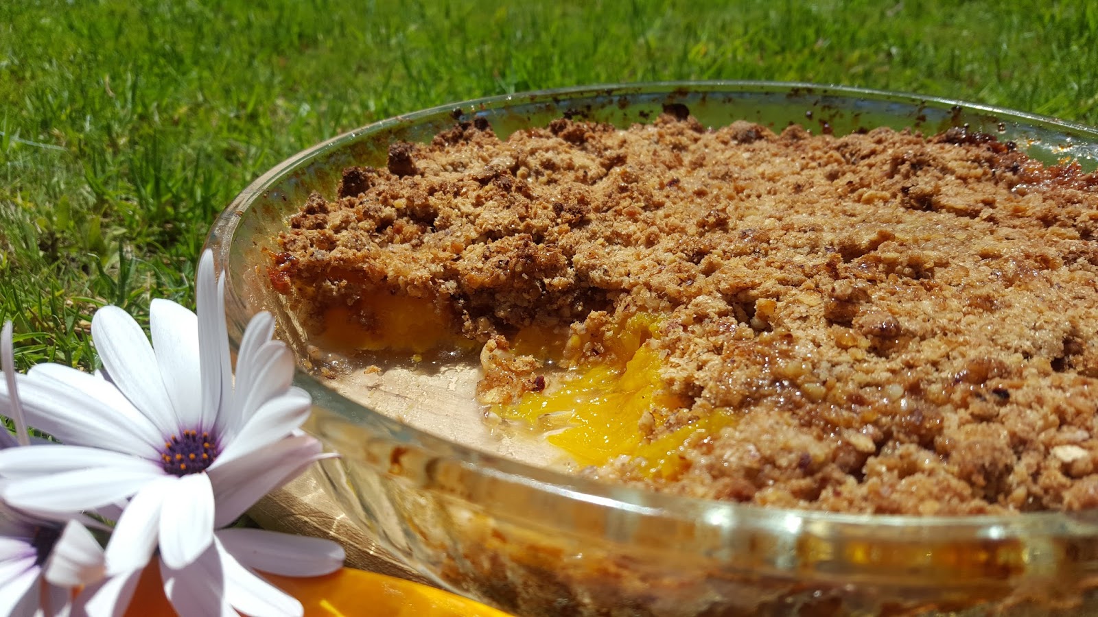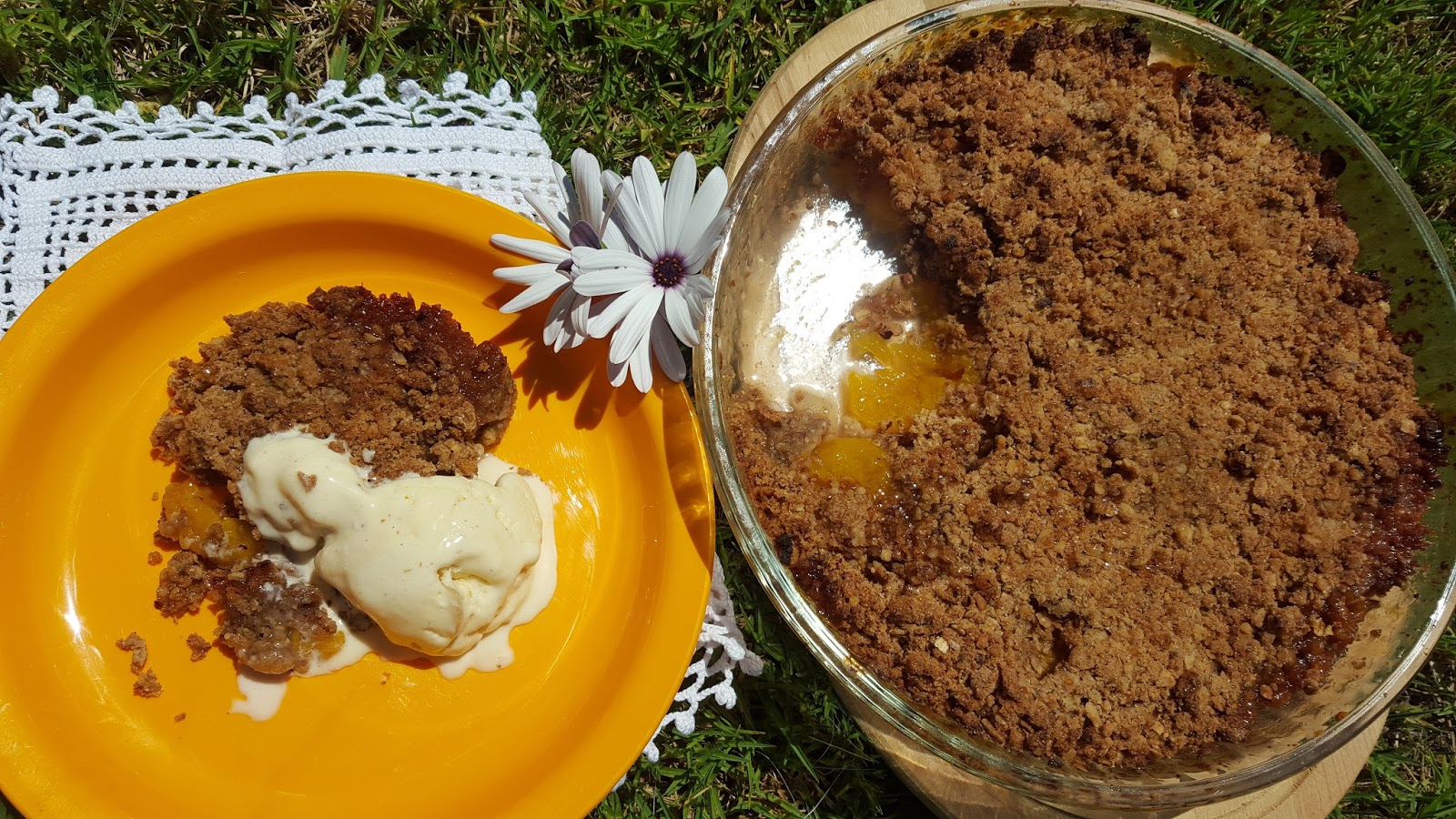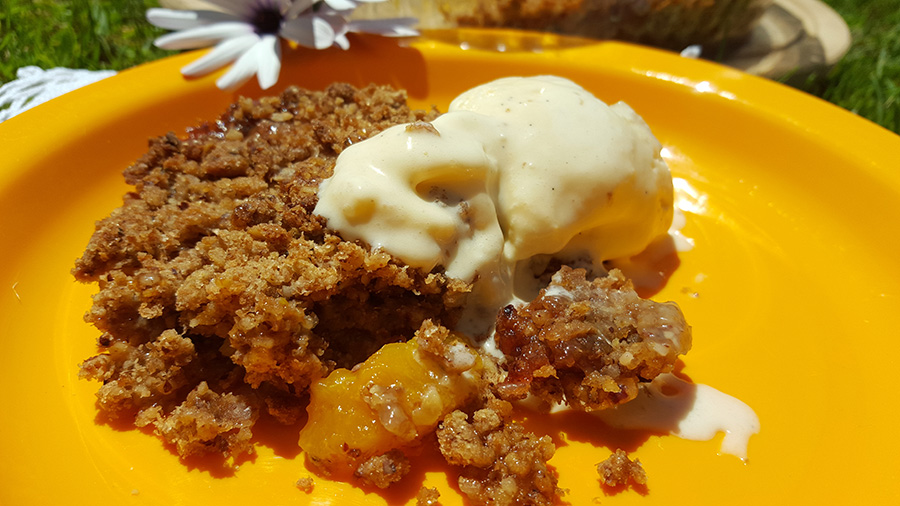 Esta é uma receita do livro “Cozinhar para os Amigos”, do Chef Gordon Ramsay… ou melhor, é inspirada nessa receita, pois fiz algumas alterações, uma das quais foi o retirar das framboesas, fazendo a sobremesa só com pêssego e gengibre. Depois de cozinharem no forno os pêssegos ativam uma certa acidez, mas a conjugação de todos os ingredientes é maravilhosa. Gordon Ramsay sugere que se sirva este crumble com gelado de baunilha ou gengibre. Por coincidência eu tinha feito gelado de gengibre e, de facto, fica uma combinação deliciosa. Esta sobremesa foi degustada entre familiares e amigos numa tarde quente de verão, passada entre banhos de piscina e banhos de sol na relva.
