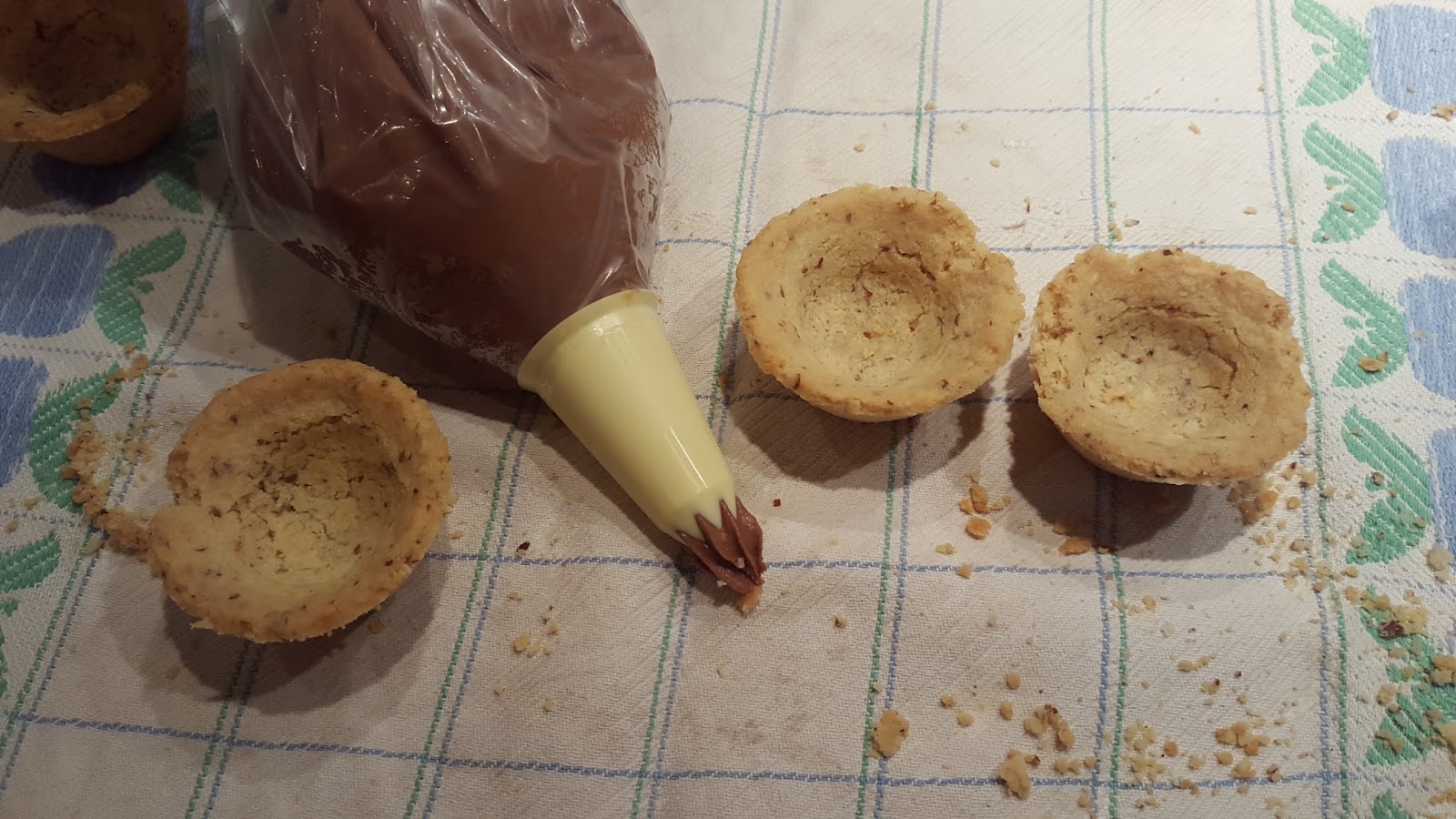 Depois prepare as bases destas delícias de castanha e chocolate. Misture a farinha com a manteiga, o açúcar e a amêndoa moída até obter uma massa tipo crumble. Unte pequenas forminhas, coloque um pedaço de massa em cada uma e molde com os dedos, forrando as formas. Leve ao forno pré aquecido a 180º durante 12 minutos. Assim que retirar as formas do forno, enquanto a massa está mole, calque ligeiramente para obter pequenas tacinhas onde vai colocar o creme de castanha. Depois deixe arrefecer totalmente e desenforme as bases, que vão ficar com uma consistência de bolacha.