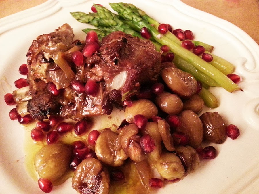 Este entrecosto acompanhou com castanhas e espargos. No fim dei-lhe um toque de frescura com bagos de romã. Gosto muito de romã e os frutos vermelhos são anti oxidantes excelentes para o funcionamento do nosso organismo. Juntem algumas bagas e frutos vermelhos aos vossos cozinhados e surpreendam-se com o resultado!