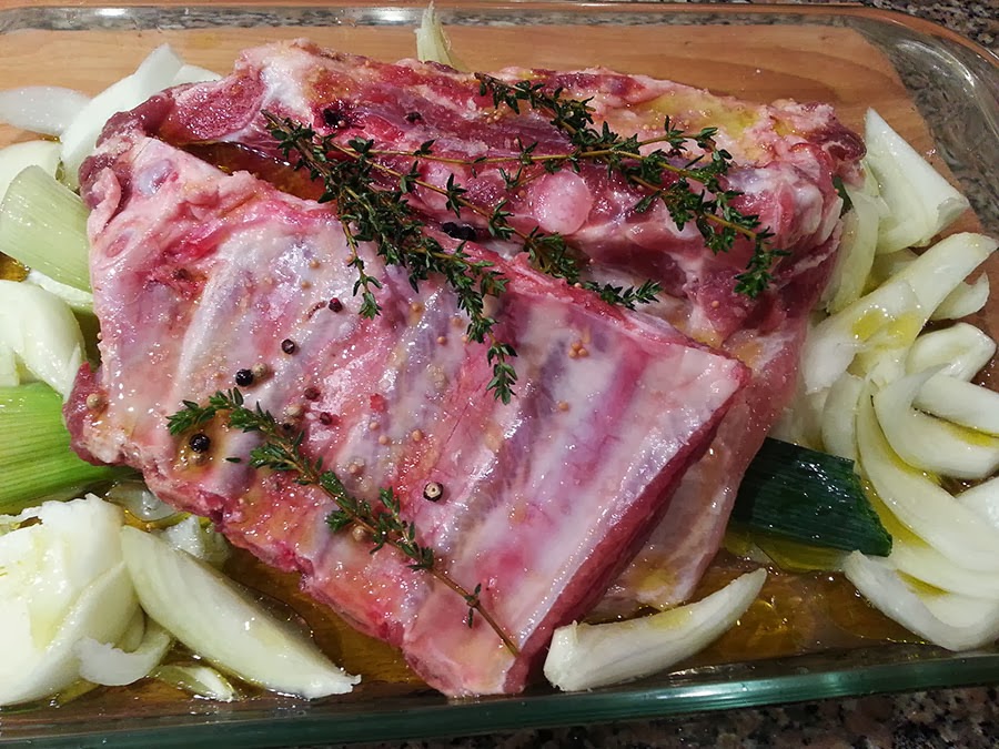 Tempere o entrecosto com sal grosso, mistura de pimentas em grão (branca, preta, rosa), alhos esmagados, louro e tomilho. Num tabuleiro de forno coloque o azeite, o vinho branco, as cebolas cortadas em meias luas e a rama de alho francês. Depois de temperado, coloque o entrecosto por cima da cama de legumes. Leve a assar ao forno a 220º até a carne estar cozinhada (o tempo varia conforme o tamanho da peça). Durante a cozedura vá virando a carne e regando com o molho.