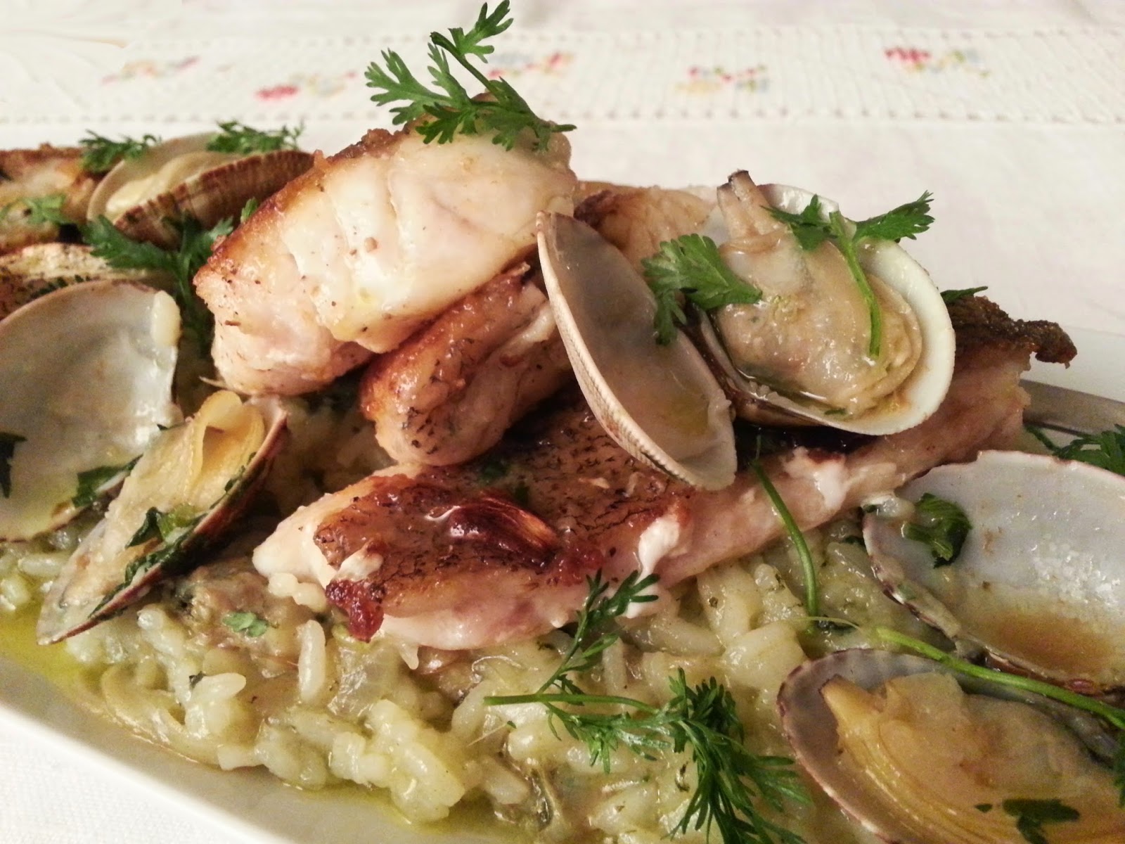 Faça o empratamento com o arroz cremoso, os filetes por cima e termine com algumas ameijoas, o azeite de cozinhar o peixe e folhas de coentros.