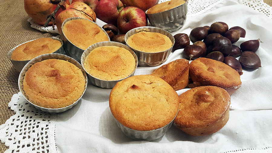 Dê um corte lateral às castanhas e coza-as até fi carem macias (cerca de 20 minutos) com o pau de canela e a erva doce. Prepare pequenas formas, untando-as com azeite e polvilhando-as com farinha.