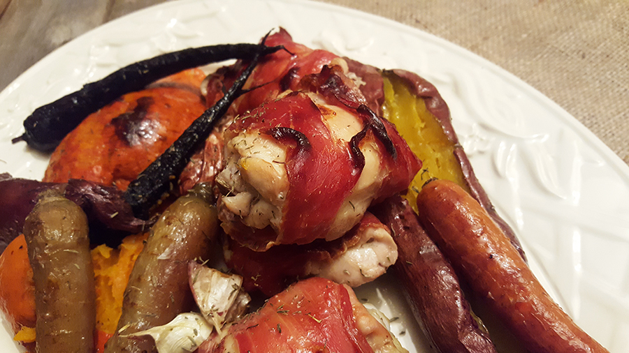 Este prato é só simplicidade, apenas isso. Ingredientes simples, uma preparação simples e o forno ligado para trazer algum calor a estes dias frios. Os legumes assados com a casca preservam todo o sabor e os sucos no seu interior. As chalotas e os alhos ficam adocicados, enquanto o frango fica com o sabor salgado do presunto e o aroma da mostarda, conjugando tudo tão bem, que se torna difícil parar de comer. Esta é uma refeição simples, para apreciar sem pressas.