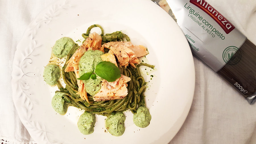 Como gosto mesmo muito de massas, foi com enorme prazer que experimentei estas massas com sabores da Milaneza. São pastas secas com pesto, caril, azeitona, etc, uma gama diferente, muito saborosa e que permite pratos suculentos. Como a massa já tem cor, aroma e muito sabor, até dispensa molhos e muitas preparações. No entanto, como sou muito gulosa e adoroooo molho pesto, ainda juntei mais pesto ao sabor a pesto da massa 🙂 Mas garanto-vos que o linguine é delicioso só por si, tem uma textura perfeita e um sabor subtil a alho e ao pesto maravilhoso, adorei!