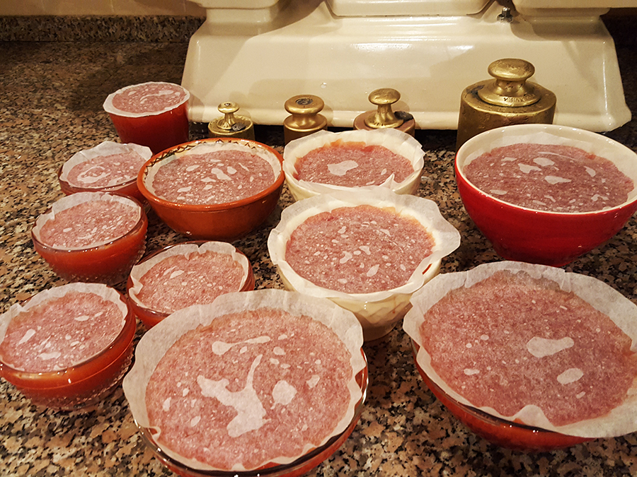 Depois de feita a marmelada, cobri cada taça com papel vegetal embebido em rum (aguardente ou alcool também serve o propósito). A minha avó paterna fazia sempre marmelada e doce de tomate por esta altura do ano. O doce de tomate era muitoooo doce e delicioso, era o meu preferido e ela guardava-o em frascos de Tofina, uma recordação dos tempos de infância que tenho muito presente. Ainda consigo sentir o sabor do doce de tomate da minha avó… Quanto à marmelada, era colocada em taças e coberta com o papel vegetal embebido em aguardente para ajudar a conservar. Eu adoro recuperar estes sabores “antigos”…
