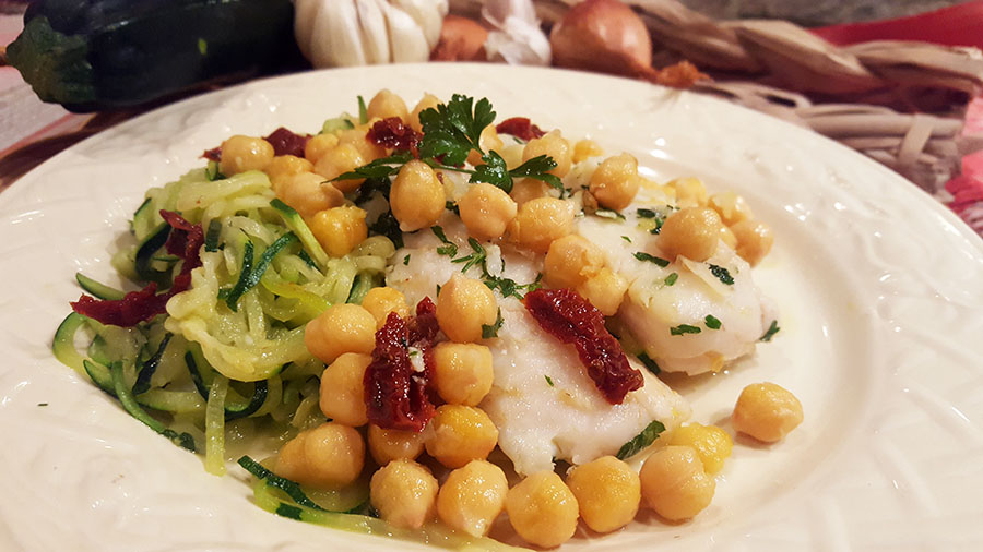 Peixe, grão e courgette. Poucos ingredientes e bastante simples, aos quais apenas juntei sabor e aromas para ficarem deliciosos e fazerem uma refeição leve e, ao mesmo tempo nutritiva. Depois de um fim-de-semana que foi de grande “comesaina”, hoje tinha que ser algo assim 🙂