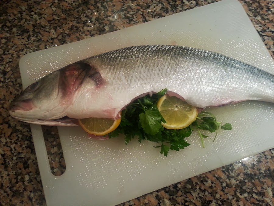 forno. Este robalo de mar foi simplesmente temperado com rodelas de limão e um