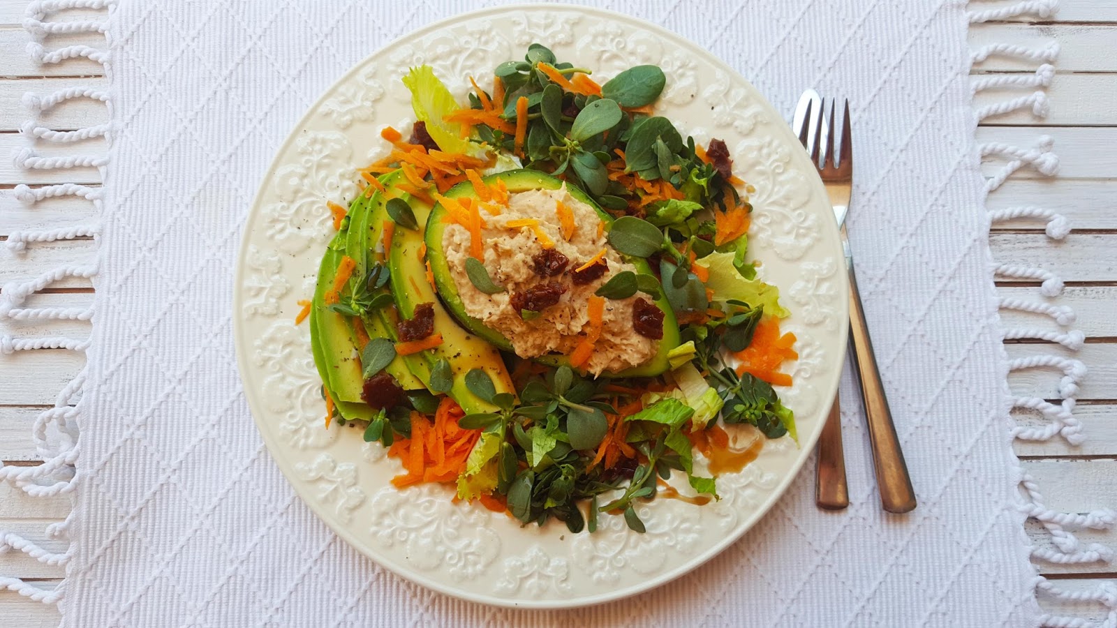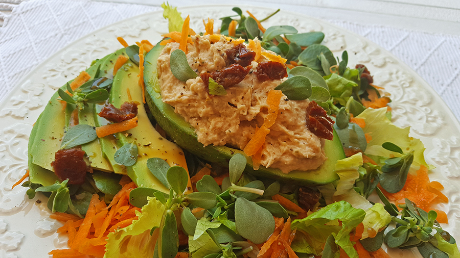 Lave as folhas verdes e disponha-as num prato. Tempere a gosto (azeite, sal, vinagre balsâmico, limão). Rale a cenoura e disponha por cima. Junte os pedacinhos de tomate seco, as fatias de abacate e mais oregãos. No meio da salada coloque uma metade de abacate em cada prato, recheada com o paté de atum.