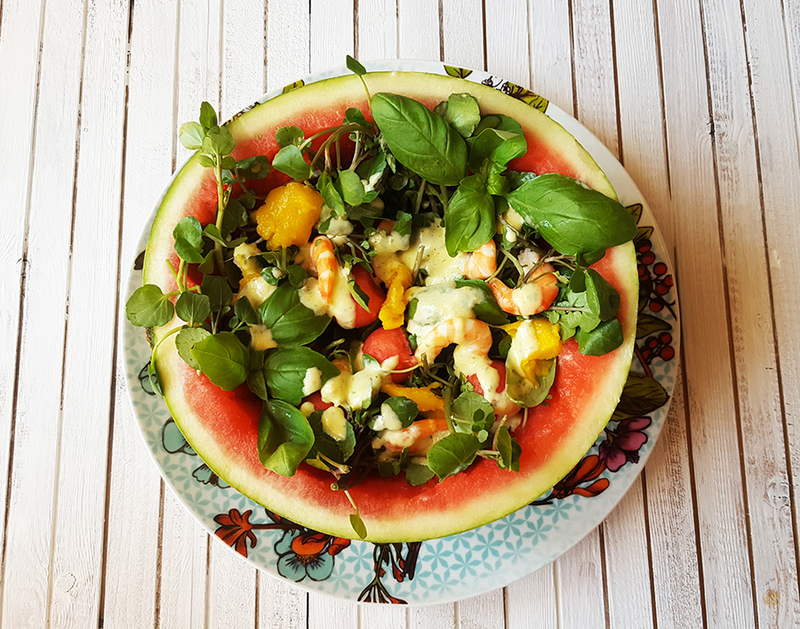 Não tem colesterol, tem imensa água, vitamina C e muito potássio, a melancia é um ótimo alimento para o verão! Eu gosto muito, principalmente quando é docinha, claro! Gosto de a comer em fatias, em sumos ou batidos. E, desta vez, até a misturei numa deliciosa salada, que ficou fresca e cheia de contraste de sabores. Os agriões amargos, as frutas doces e os camarões fizeram uma combinação daquelas que me agrada mesmo muito. Espero que também gostem.