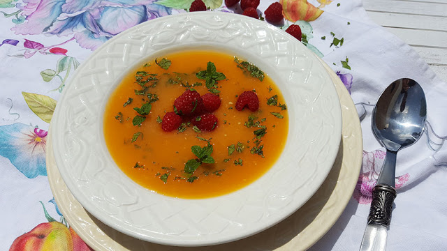 Com este calor, o que sabe bem é uma sopinha… bem fresca! Esqueçamos por agora as sopas quentinhas e reconfortantes, porque só algo fresco nos pode confortar a alma e o corpo, face à caloraça que anda por aí… Pessoalmente, gosto sempre muito de saladas, em qualquer altura do ano, mas nesta época ainda mais! Além das saladas, há outras formas muito saborosas de comer legumes e frutas em tempo de verão: salteados, assados na grelha juntamente com churrasco de carne ou peixe, em sobremesas… e também em sopas frias! Espero que gostem desta, é muito fácil de fazer e de comer 😉 Fica super fresca, não só por ser servida fria, mas porque os sabores são mesmo uma explosão de frescura e saúde. Podem acompanhar com umas tostas integrais ou servir como entrada ou até em copos de “shot” se quiserem fazer um almoço com vários petiscos de verão.