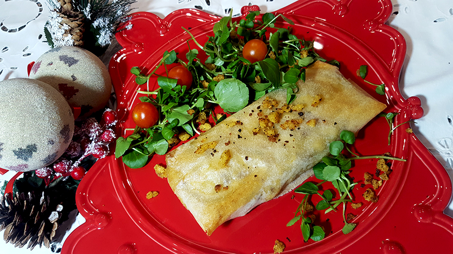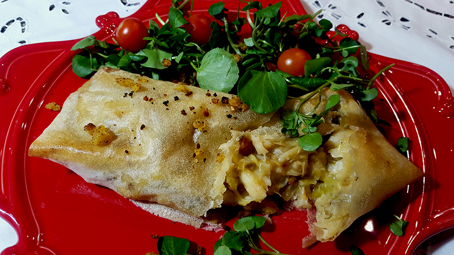 Quando o preparado estiver frio, recheie as folhas de massa, fazendo uma espécie de crepes. Coloque uma folha de massa na bancada, pincele com manteiga derretida, colo a outra folha e recheie com o preparado. Feche o “crepe”, mais um avez com a ajuda de um pouco de manteiga para “colar”. Leve ao forno pré aquecido a 190º durante cerca de 15 minutos ou até a massa estar tostada e estaladiça. Sirva com salada de agrião e tomate cereja. Para guarnecer juntei miolo de broa tostado na frigideira com um pouco de azeite e alho.