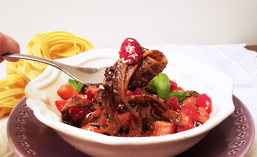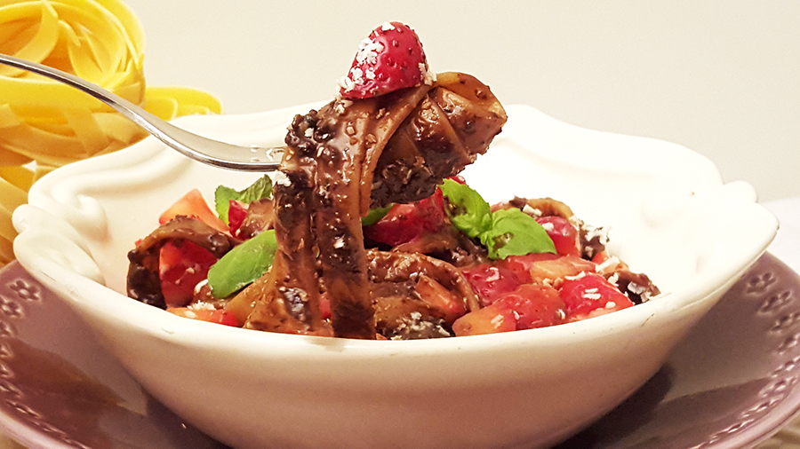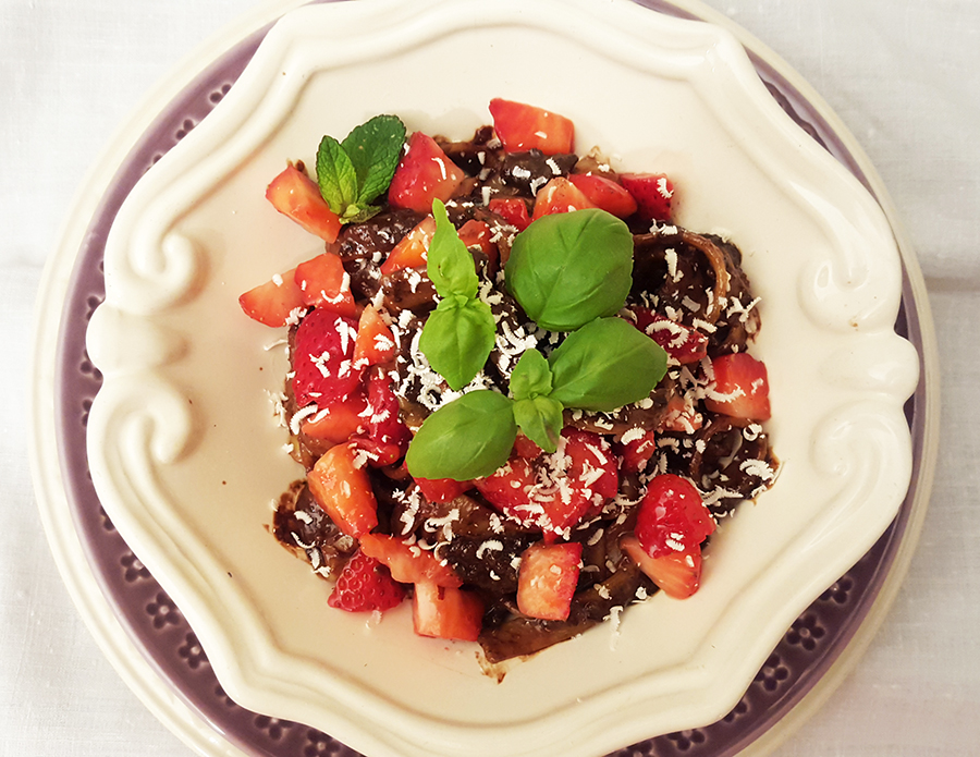 a massa com o molho pesto de chocolate. No fim junte uma salada feita com os morangos