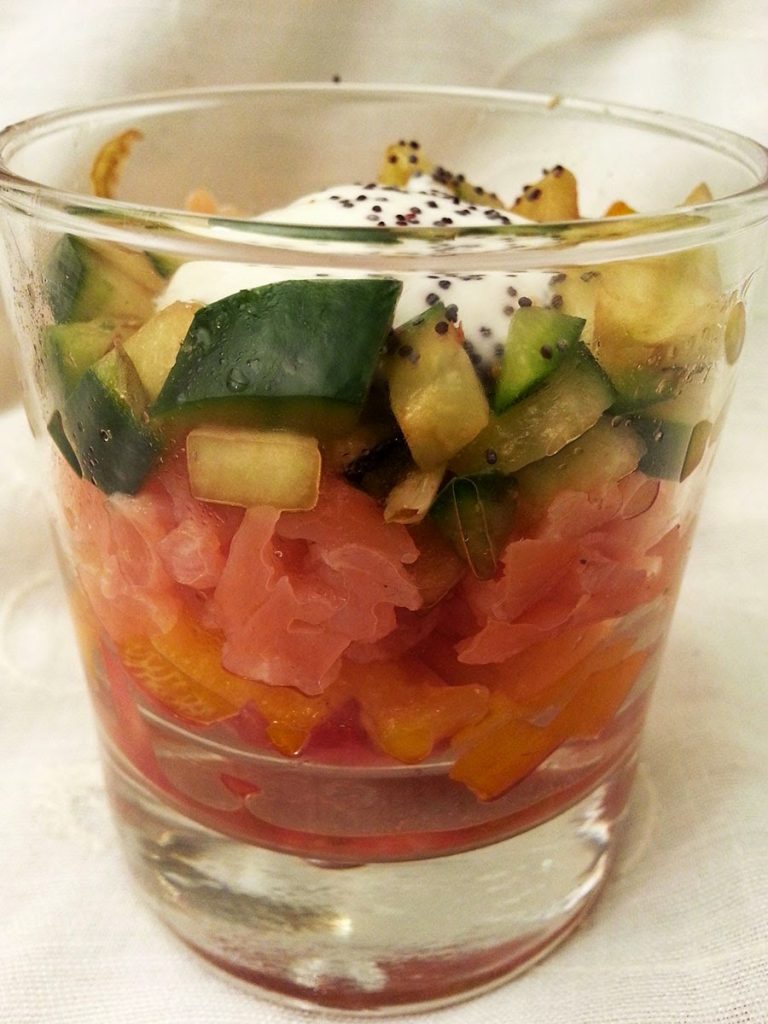 Em pequenos copinhos disponha as camadas por cores: primeiro o tomate, depois o pimento amarelo, depois o salmão e por último o pepino.