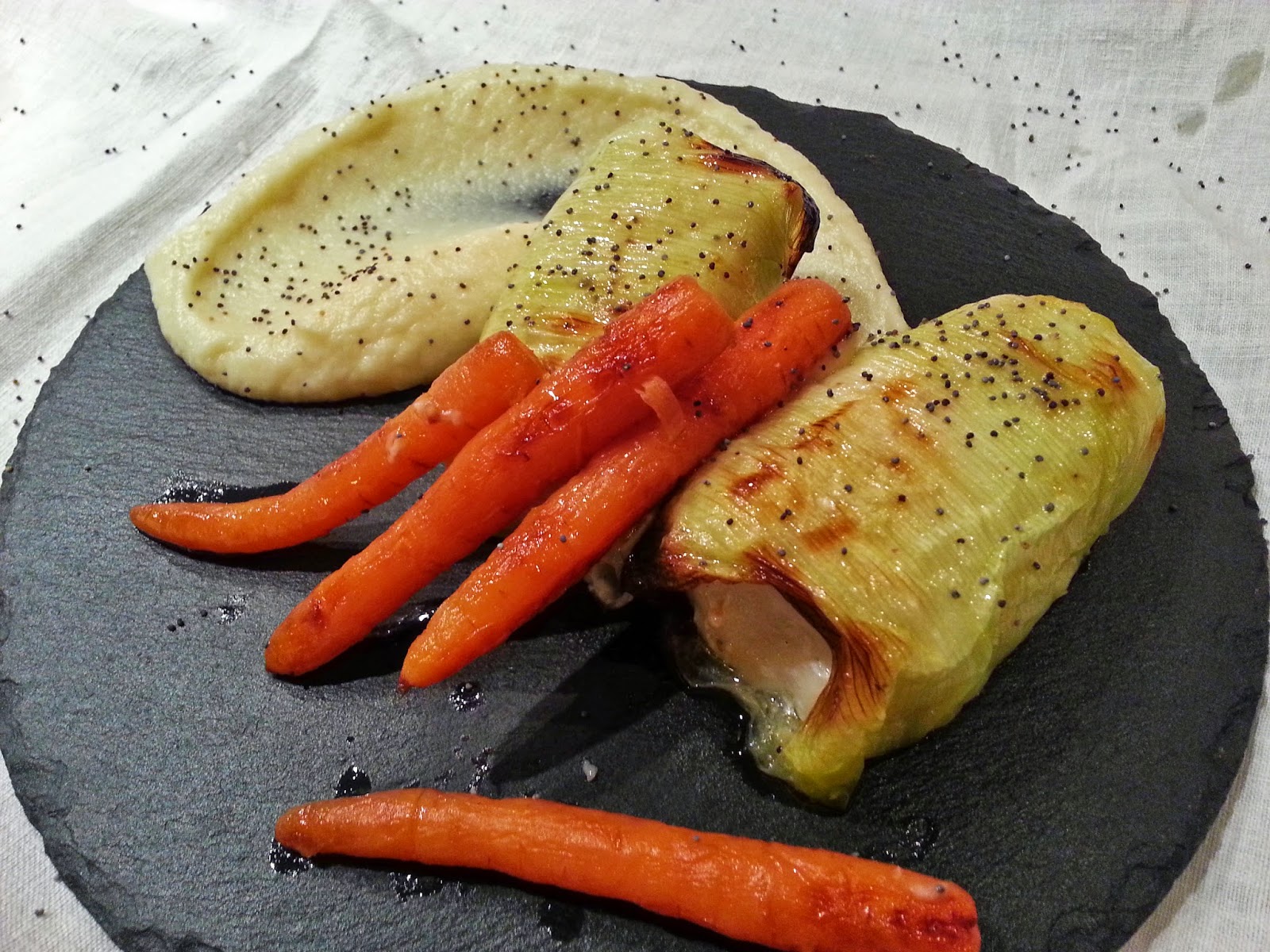 Emprate tudo e regue com um fio de azeite. Espalhe algumas sementes de papoila por cima do puré para dar textura.