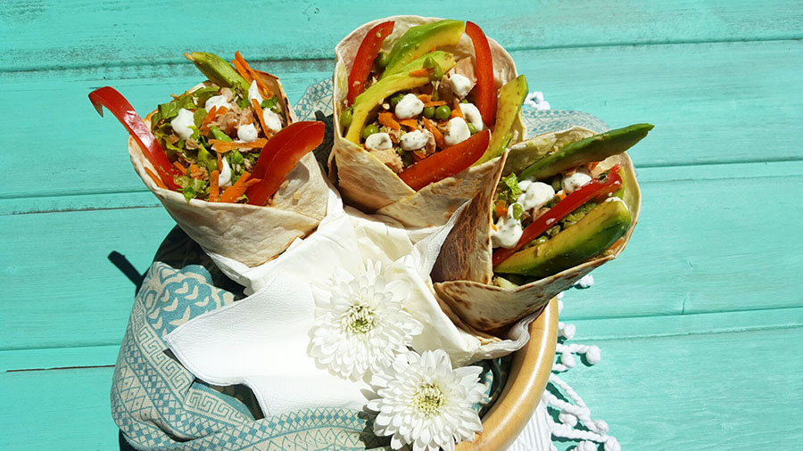 No momento de montar os wraps, aqueça-os ligeiramente na frigideira ou micro-ondas, conforme as instruções da embalagem. Abra o abacate e corte-o em gomos, humedecendo logo com o sumo da lima para não oxidar. Corte o pimento em tiras. Monte os wraps, colocando 2 a 3 colheres de sopa de salada russa em cada um, algumas tiras de abacate e pimento. Guarneça com um pouco mais de maionese. Feche-os, enrole com um guardanapo e sirva. Se optar por levar os wraps na lancheira para comer mais tarde, embrulhe-os em folha de alumínio.